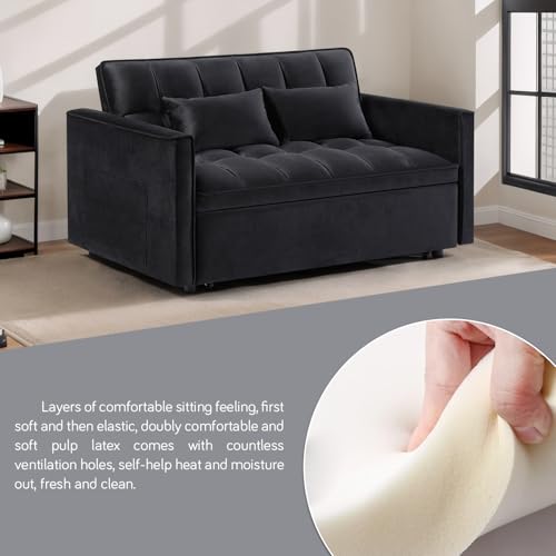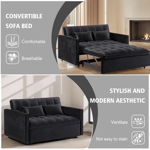 3 In 1 Velvet Convertible Sofa Bed, Pull Out Couch Bed with Reclining Backrest And 2 Pillows, 54″ Full Size Loveseat Sleeper Sofa Futon Couch Beds, Couches For Small Spaces, Living Room (Black)
