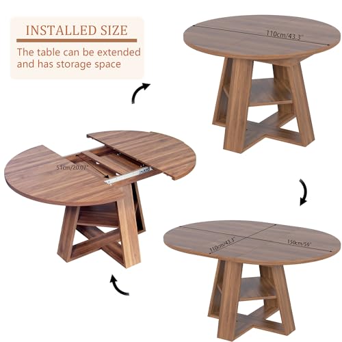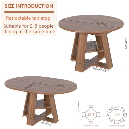 Retractable dining table for 4-8 people: Considering the use in different scenarios, the dining table adopts a retractable design and a smooth and silent rail. By assembling independent extension leaves in the middle of the dining table, it can be quickly and easily expanded from the original 43.3” round dining table to a 59” L x 43.3” W oval dining table. The extension leaves can be stored under the tabletop, making your space more flexible