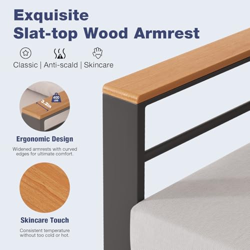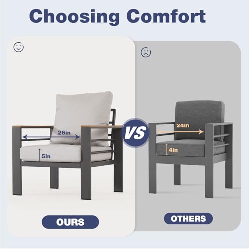 【UPGRADED】① Wider 26 in seat & Thicker 5 in cushion, (industry standard 24 in & 5 in); ② Reinforced Structure, Hurricane-grade steel frame with thickened support beams; ③High-end a luminum with heat treatment wood grain coating, more fashionable and reduce the metal heat in summer, protect the skin; ④Top Olefin fabric, easy to clean, ten years without fading