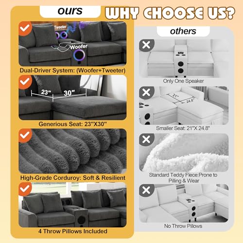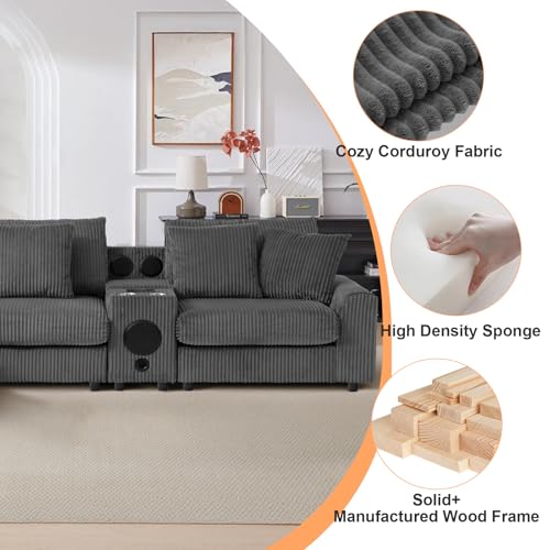 MAKIAAP 114″ Corduroy Sectional Modular Couch with Speakers, L Shaped Couches Comfy Deep Sofa with Console, USB Charger, Cup Holders, Storage, Ottoman for Living Room (Gray, 114in)