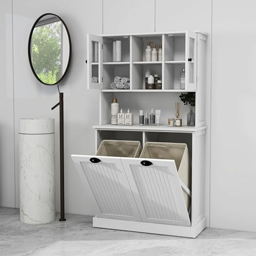 Large Storage: The tall tilt out laundry cabinet has two hidden laundry hamper that can be used to store dirty clothes or towels. There are different storage spaces above that can be used to store laundry detergent, towels, hair dryer, tissue, etc.
